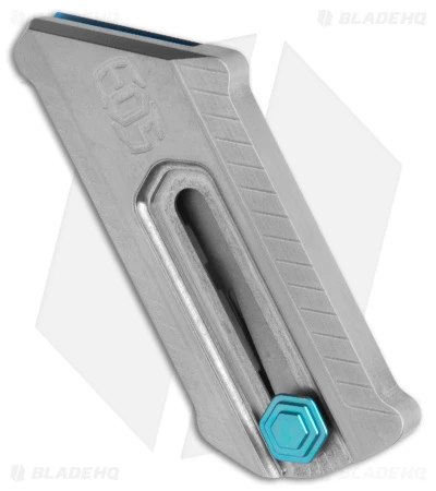 - Satin finished titanium handle with blue backing and slider.